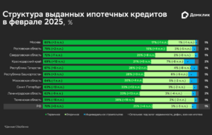 Лидерами по доле сделок со вторичным жильем вновь стали регионы с относительно низким объемом строительства: Чеченская Республика, Томская и Амурская области. В феврале доля вторичного рынка в общем объеме выдач составила 78,3%, 56,0% и 45,1% соответственно.