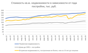 Стоимость готовой недвижимости советской постройки, после снижения в начале 2025 года несколько снизилась и в январе составила 110,8 тыс. руб. за квадратный метр, однако за год она прибавила 13,4%.