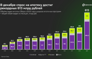 В декабре 2025 года спрос на ипотеку подскочил до 613 млрд рублей – максимальное значение за последние 5 лет. Почти 76% от всего объёма выдач пришлось на Семейную ипотеку, однако рекордных показателей достиг и спрос на базовую ипотеку – 110 млрд рублей.