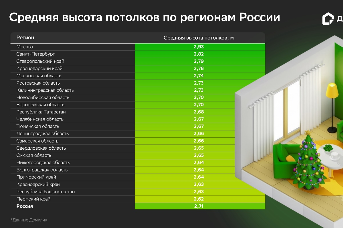 Хотя в целом по стране показатель высоты потолков составляет 2,7 м и мало меняется от региона к региону, одни из самых низких средних показателей оказались в Пермском крае (2,62 м), Республике Башкортостан и Красноярском крае – по 2,63 м.