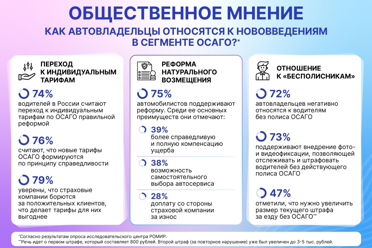 Существенное большинство российских водителей считают переход к индивидуальным тарифам по ОСАГО правильной реформой – 74% в той или иной степени ее поддерживают. Об этом свидетельствуют данные ежегодного опроса исследовательского центра РОМИР, в котором приняли участие 2500 респондентов из разных регионов России.