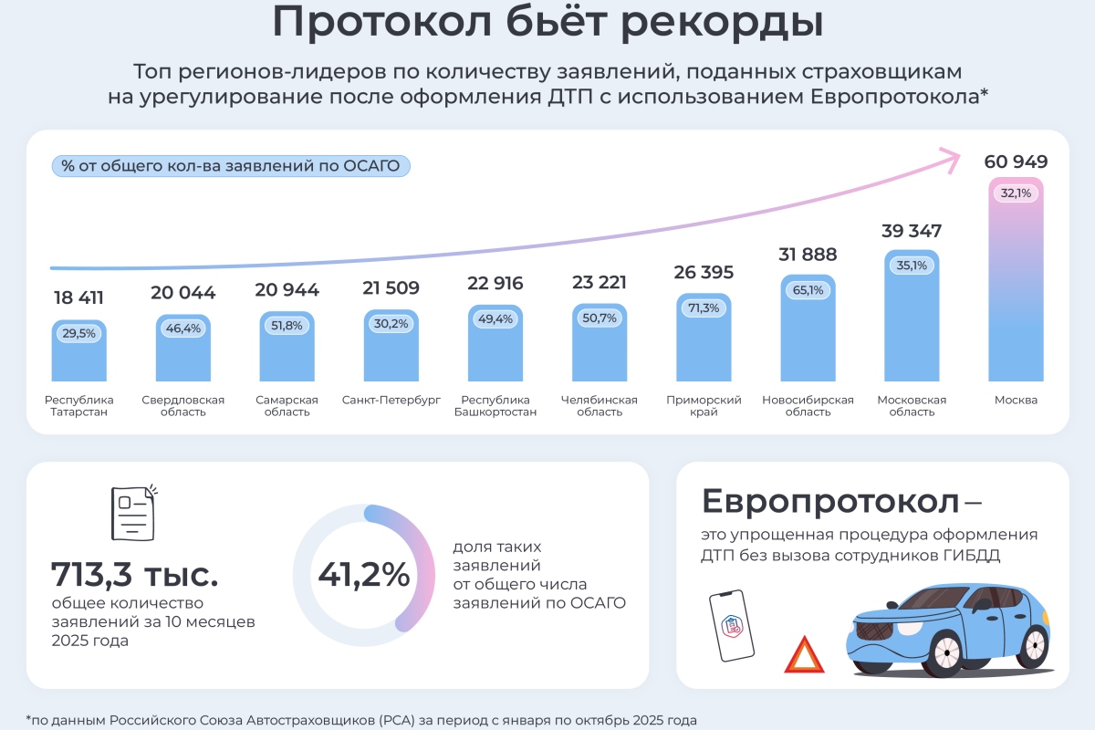 Согласно статистике Российского Союза Автостраховщиков (РСА) за период с января по октябрь 2025 года, в тройку лидеров среди российских регионов по количеству заявлений на возмещение убытков после ДТП, оформленных с использованием Европротокола, вошли Москва (60 949 штук от общего числа заявлений по ОСАГО), Московская область (39 347) и Новосибирская область (31 888).