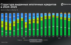В среднем доля новостроек в общем объёме выдач с июля по декабрь 2024 года не превышала 57%, однако в период с января по июнь 2025 года средняя доля первичного жилья в выдачах составила 74% (+17 п.п. ко второй половине 2024 года). На столь высокие показатели новостроек в выдачах влияют программы с господдержкой, а в особенности «Семейная ипотека». Так, по итогам первого полугодия более 85% всех выдач по новостройкам пришлось на «Семейную ипотеку».