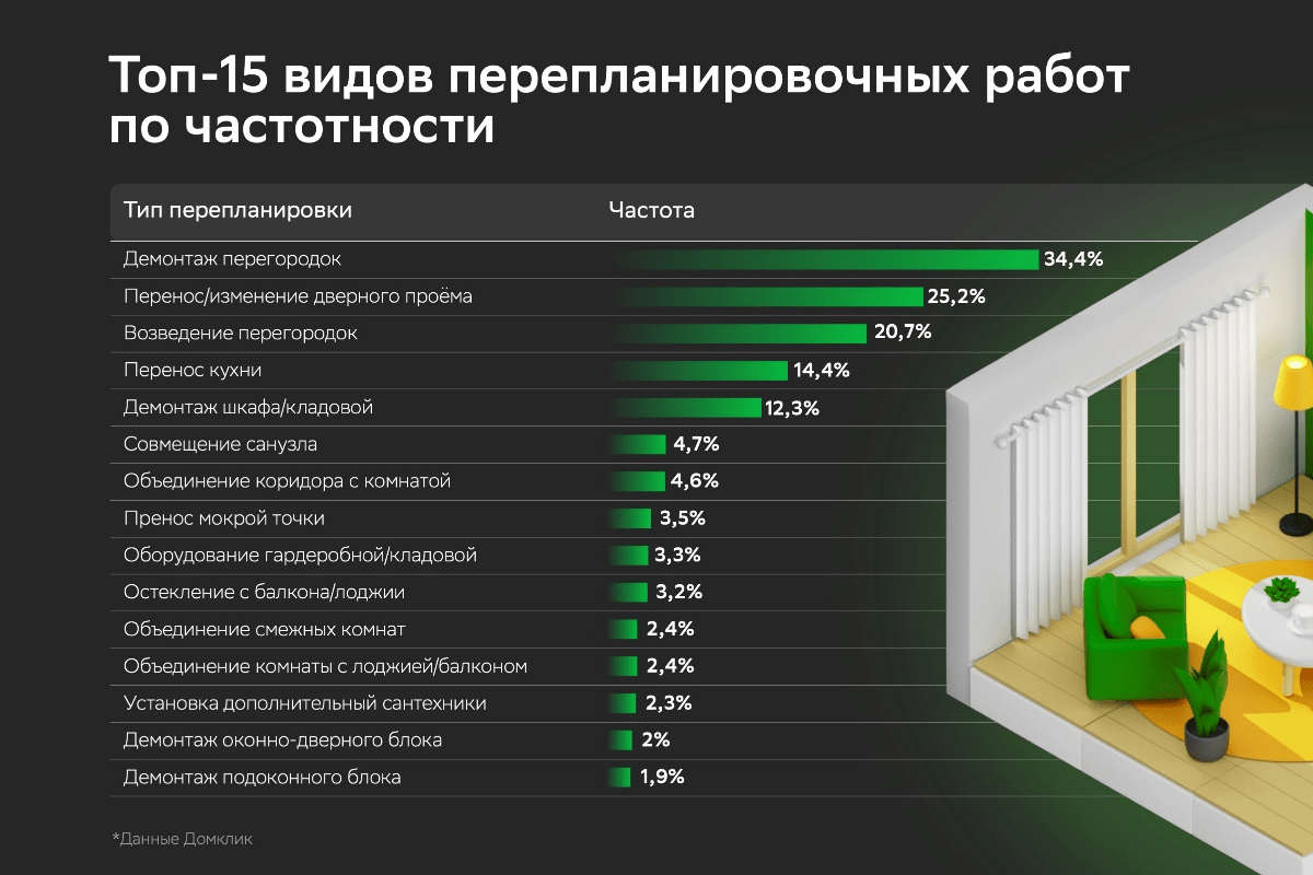Исследование Домклик: какие виды перепланировок встречаются в российских квартирах