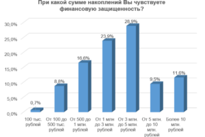 Отвечая на вопрос «При какой сумме накоплений Вы чувствуете финансовую защищенность?» половина опрошенной молодежи (52%) заявила, что ей необходима больше 1 миллиона рублей: сумму от 1 до 3 млн. рублей назвали 23,9% респондентов, а от 3 до 5 млн. рублей — 28,9%. Из общего числа почти каждый десятый (9,5%) опрошенный респондент сказал, что ему нужно еще больше – от 5 до 10 млн. рублей. Почти столько же назвали сумму еще больше – 10 млн. рублей (так ответили 11% опрошенных). Вместе с тем 16,6% считают приемлемой сумму от 500 тыс. до 1 млн рублей, а 8,8% – от 100 до 500 тыс. рублей. Минимум в 100 тыс. рублей назвали лишь 0,7% респондентов: на уровне статистической погрешности.