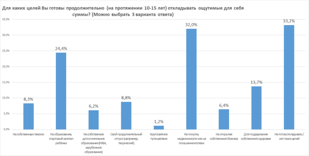 Когда речь заходит о целях, ради которых молодые готовы копить вдолгую (а это порядка 10-15 лет), ответы разнятся: самый популярный ответ – покупка квартиры, так ответили 32% опрошенных. На втором месте по популярным долгосрочным целям у сегодняшних зумеров, у большинства которых еще нет детей, – воспитание собственного ребенка, оплата его образования и формирование стартового капитала для него. 13% респондентов, готовы откладывать на протяжении длительного периода для поддержания собственного здоровья, а 8% — на длительный творческий отпуск, столько же голосов набрал пункт, связанный с пенсией.