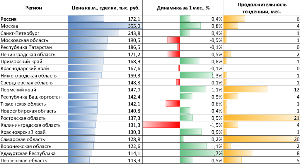 Наиболее явный спад цены за кв. м отмечен в Республике Дагестан (–1,1%, спад продолжается 6 месяцев подряд) и Свердловской области, где спад в 0,3% зафиксирован после 6 месяцев непрерывного роста.
