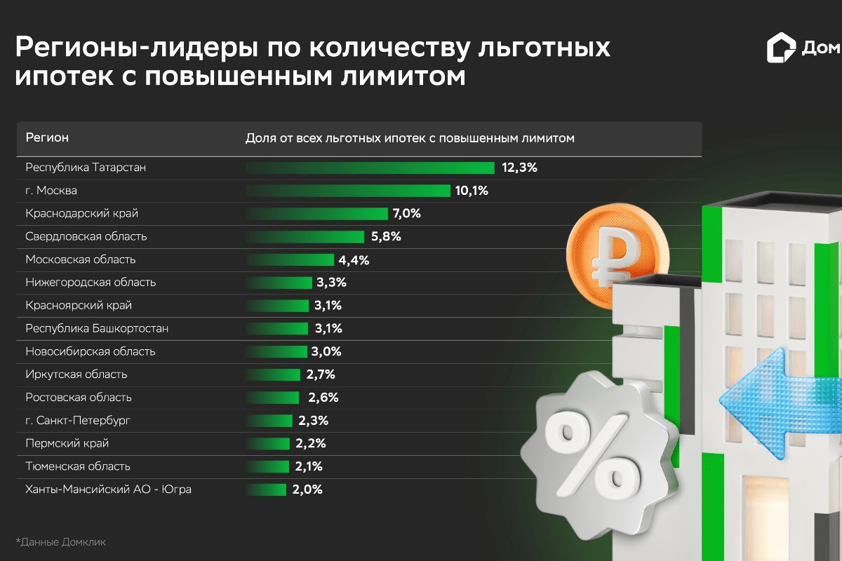 Список регионов-лидеров по числу выдач ипотек с комбинированной ставкой отличается от стандартного. По сверхлимитным выдачам лидирует Татарстан – на него пришлось 12,3% от всех кредитов данного типа, хотя в обычном рейтинге республика занимает лишь 10-ю строчку. Московская область, являющаяся лидером по общему числу выдач, по количеству льготных ипотек с комбинированной ставкой находится на пятой строчке; Санкт-Петербург с 7-го места переместился на 12-е, а Ленинградская область – с 10-го на 55-е.