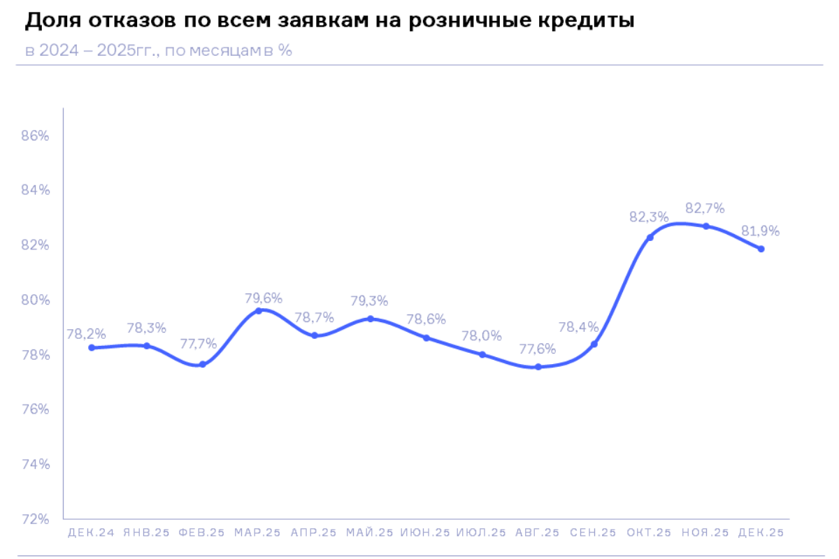 По данным кредиторов, передающих сведения в Национальное бюро кредитных историй (НБКИ), доля отказов по всем заявкам на розничные кредиты (потребительские кредиты, пос-кредиты, кредитные карты, автокредиты и ипотека) в декабре 2025 года составила 81,9%, увеличившись по сравнению с аналогичным периодом прошлого года на 3,7 процентного пункта (п.п.) (в декабре 2024 года – 78,2%). При этом по сравнению с предыдущим месяцем данный показатель, напротив, немного сократился — на 0,8 п.п. (в ноябре 2025 года – 82,7%).