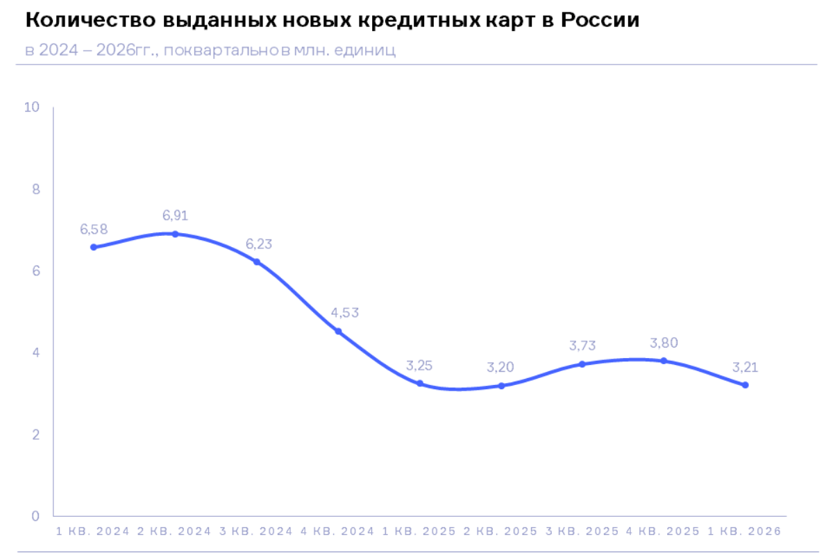 Что касается марта 2026 года, то число выданных новых кредитных карт в этом месяце составило 1,20 млн. ед., увеличившись по сравнению с аналогичным периодом прошлого года на 8,6% (в марте 2025 года – 1,10 млн. ед.), а по сравнению с предыдущим месяцем – на 17,6% (в феврале 2026 года – 1,02 млн. ед.). В то же время по сравнению с мартом 2024 года данный показатель, напротив, сократился на 48,4% (или в 1,9 раза) (в марте 2024 года – 2,32 млн. ед.).