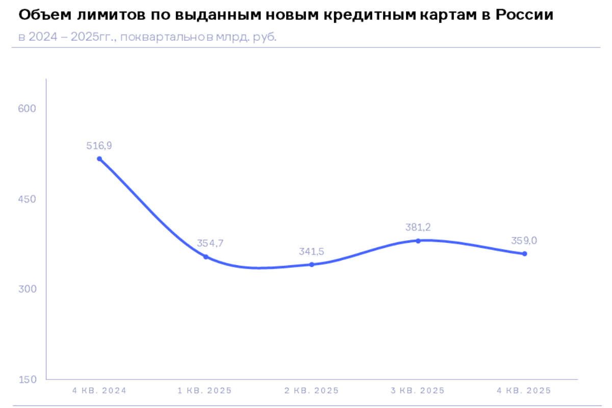 При этом по сравнению с аналогичным периодом прошлого года объем лимитов по новым выданным кредитным картам в 4 квартале 2025 года сократился еще существеннее — на 30,6% (в 4 кв. 2024 года – 516,9 млрд. руб.).