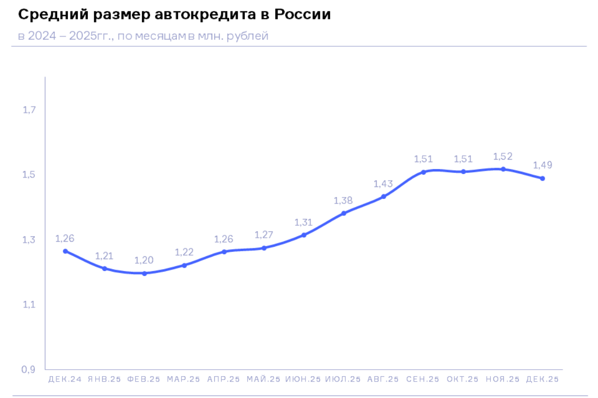 По данным кредитных организаций, передающих сведения в Национальное бюро кредитных историй (НБКИ), в декабре 2025 года средний размер выданных автокредитов составил 1,49 млн. руб., увеличившись по сравнению с аналогичным периодом прошлого года на 17,7% (в декабре 2024 года – 1,26 млн. руб.).