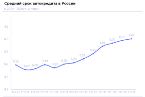 По данным кредитных организаций, передающих сведения в Национальное бюро кредитных историй (НБКИ), в декабре 2025 года средний срок автокредитов (на новые автомобили и автомобили с пробегом) составил 5,8 лет, увеличившись по сравнению с аналогичным периодом 2024 года на 12,0% (в декабре 2024 года – 5,2 лет), а с предыдущим месяцем — на 0,7% (в ноябре 2025 года – 5,8 лет). Данный показатель растет уже восьмой месяц подряд и достиг наивысшего значения за последний год.