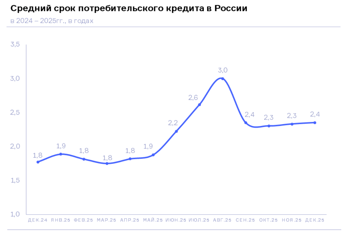 По данным кредиторов, передающих сведения в Национальное бюро кредитных историй (НБКИ), в декабре 2025 года средний срок потребительских кредитов (кредитов наличными) составил 2,4 года, увеличившись по сравнению с аналогичным периодом 2024 года на 32,6% (в декабре 2024 года – 1,8 года), а по сравнению с предыдущим месяцем — на 0,9% (в ноябре 2025 года – 2,3 года). При этом необходимо отметить, что после роста данного показателя в апреле-августе 2025 года (с пиком в августе – 3,0 года) средний срок потребкредита существенно снизился, стабилизировавшись в сентябре-декабре на уровне 2,3 — 2,4 года.