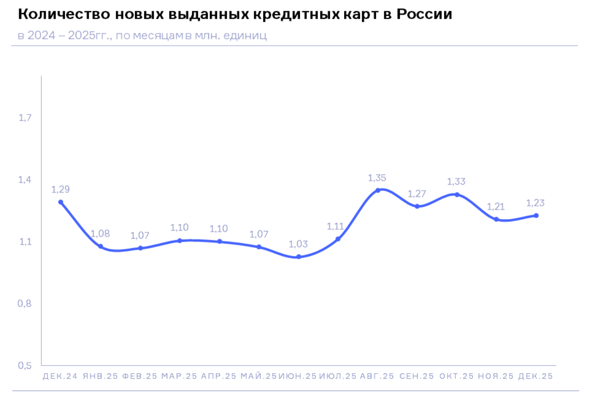 В то же время по сравнению с предыдущим месяцем число новых выданных кредитных карт в декабре 2025 года незначительно выросло — на 1,6% (в ноябре 2025 года – 1,21 млн. ед.).