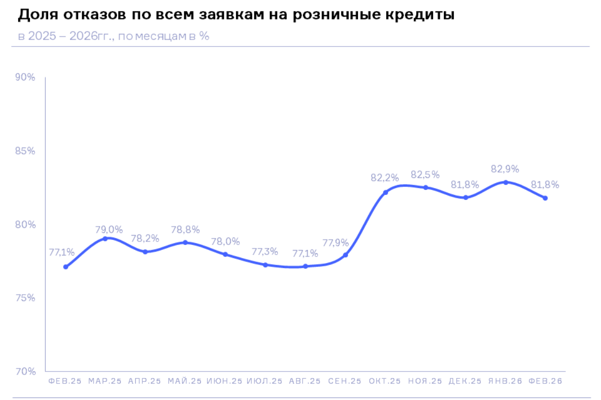 НБКИ: в феврале 2026 года доля отказов по всем заявкам на розничные кредиты составила 81,8%