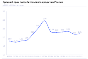 В то же время по сравнению с предыдущим месяцем средний срок потребкредита в феврале 2026 года вырос незначительно — на 1,0% (в январе 2026 года – 2,2 года).