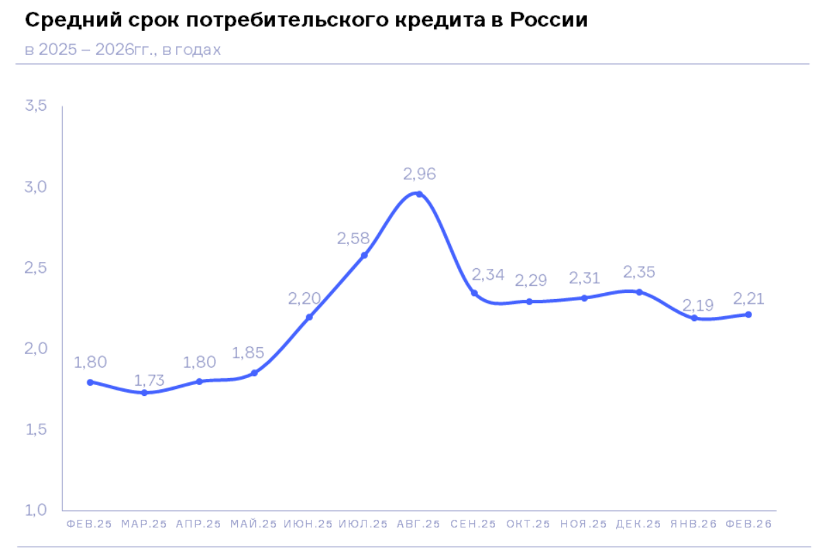 По данным кредиторов, передающих сведения в Национальное бюро кредитных историй (НБКИ), в феврале 2026 года средний срок потребительских кредитов (кредитов наличными) составил 2,2 года, увеличившись по сравнению с аналогичным периодом прошлого года на 23,1% (в феврале 2025 года – 1,8 года).
