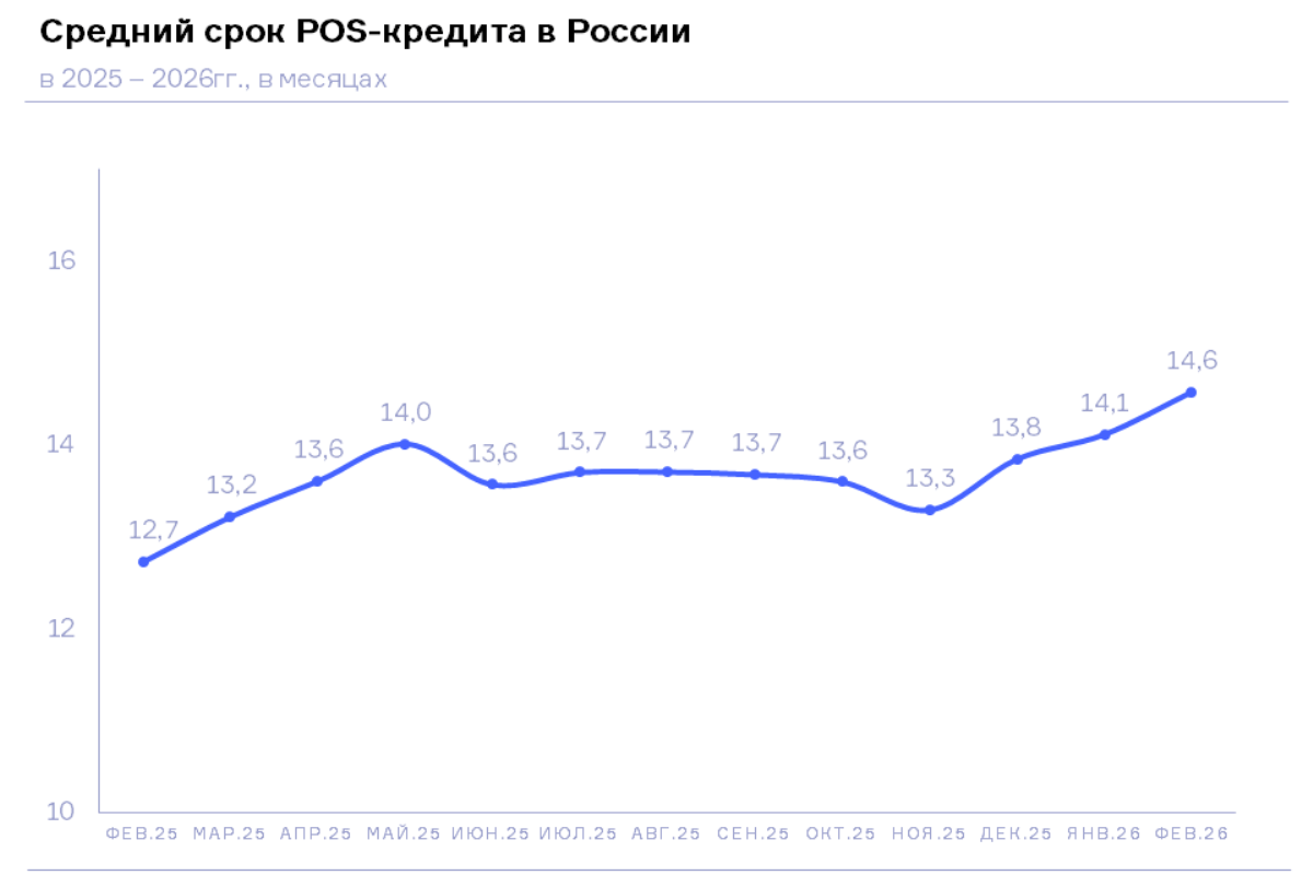 По данным кредиторов, передающих сведения в Национальное бюро кредитных историй (НБКИ), в феврале 2026 года средний срок POS-кредитов (кредитов гражданам, предоставленных в торговых точках) составил 14,6 месяца, увеличившись по сравнению с аналогичным периодом прошлого года на 14,5% (в феврале 2025 года – 12,7 мес.), а с предыдущим месяцем на 3,3% (в январе 2026 года – 14,1 мес.). В феврале 2026 года данный показатель достиг наивысшего значения с октября 2024 года.