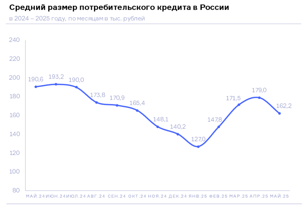 По данным кредиторов, передающих сведения в Национальное бюро кредитных историй (НБКИ), в мае 2025 года средний размер выданных потребительских кредитов составил 162,2 тыс. руб., снизившись по сравнению с предыдущим месяцем на 9,4% (в апреле 2025 года — 179,0 тыс. руб.).