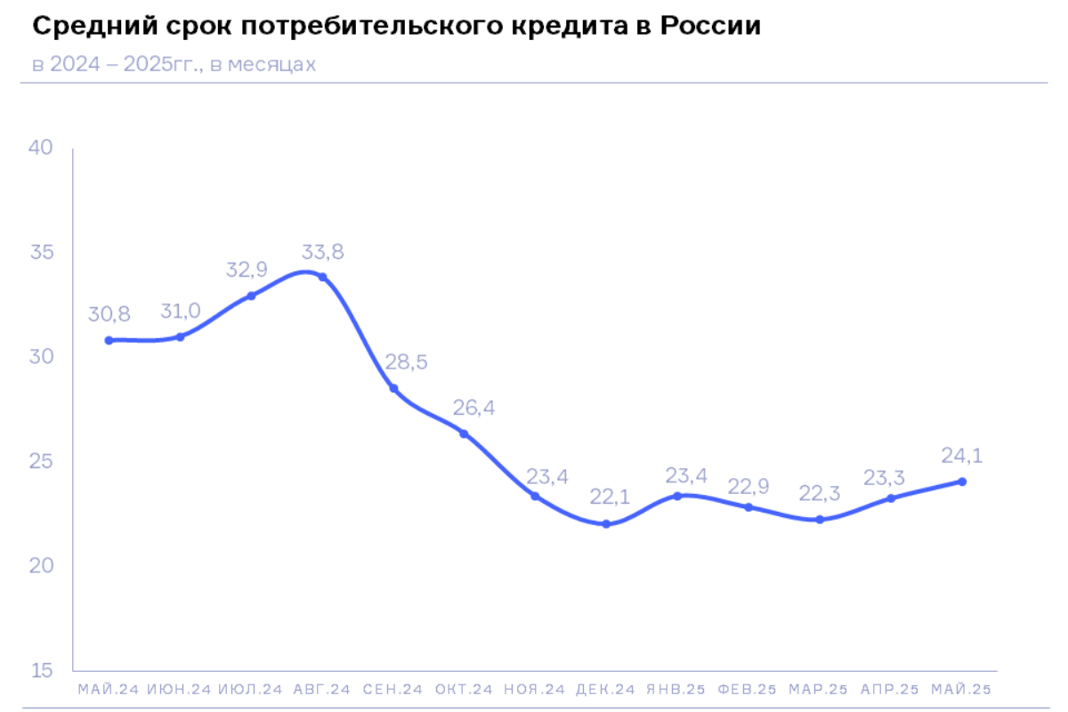 В свою очередь по сравнению с наименьшим значением среднего срока потребкредита в конце 2024 года, в мае 2025 года данный показатель увеличился на 9,2% (или на 2,0 месяца) (в декабре 2024 года – 22,1 месяца).