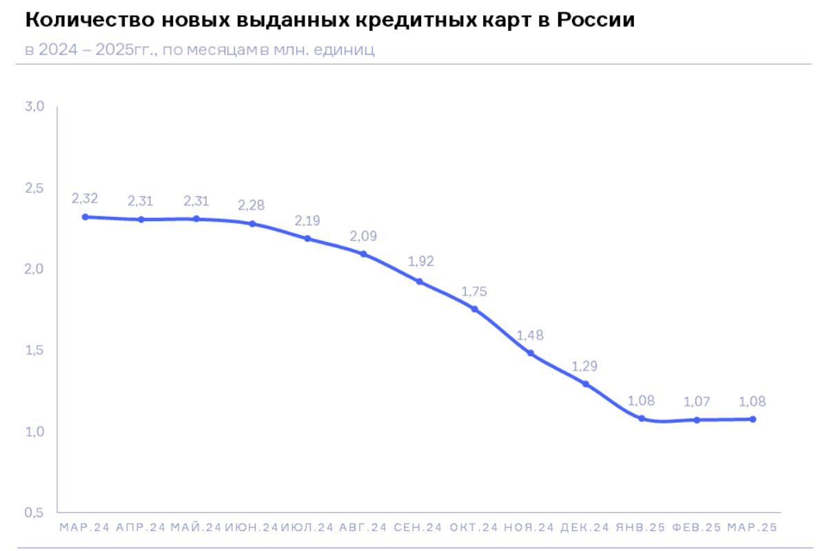 По данным кредиторов, передающих сведения в Национальное бюро кредитных историй (НБКИ), количество новых выданных кредитных карт в марте 2025 года составило 1,08 млн. ед., сократившись по сравнению с аналогичным периодом прошлого года на 53,7% (или в 2,2 раза) (в марте 2024 года – 2,32 млн. ед.).