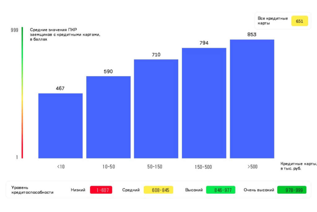 Стоит отметить, что среднее значение Персонального кредитного рейтинга (ПКР) заемщика по кредитным картам составляет 651 балл (минимальное значение – 1 балл, максимальное – 999 баллов) (Диаграмма 2).