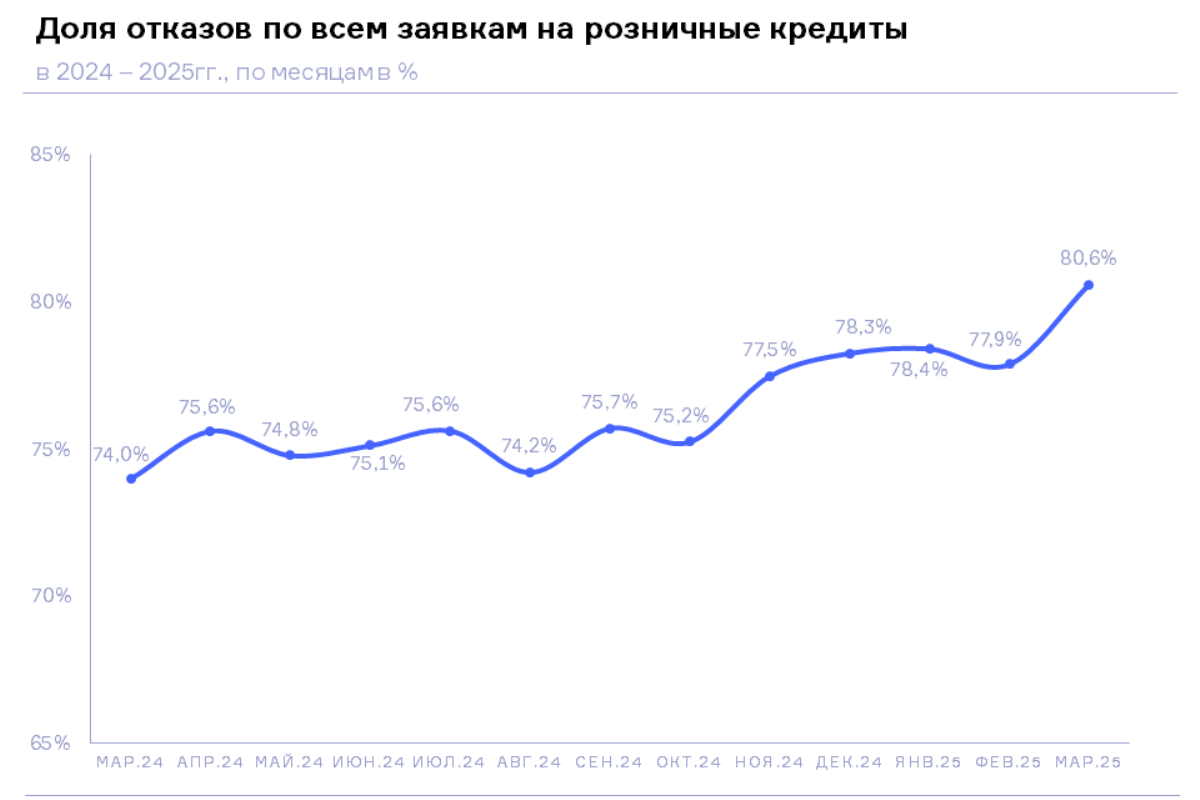 НБКИ: в марте 2025 года доля отказов по всем заявкам на розничные кредиты выросла до 80,6%