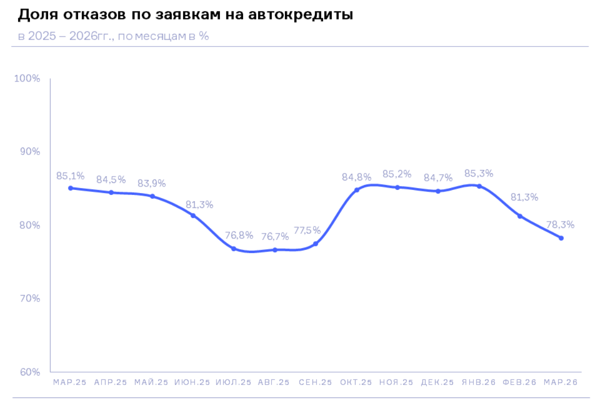 По данным кредиторов, передающих сведения в Национальное бюро кредитных историй (НБКИ), доля отказов по заявкам на автокредиты в марте 2026 года составила 78,3%, снизившись по сравнению с аналогичным периодом прошлого года на 6,8 процентного пункта (п.п.) (в марте 2025 года – 85,1%), а с предыдущим месяцем — на 3,0 п.п. (в феврале 2026 года – 81,3%). Стоит отметить, что данный показатель снижается второй месяц подряд, но по-прежнему находится на высоком уровне.