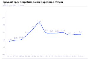 В то же время по сравнению с предыдущим месяцем средний срок потребкредита в марте 2026 года вырос незначительно — на 0,8% (в феврале 2026 года – 2,17 года).