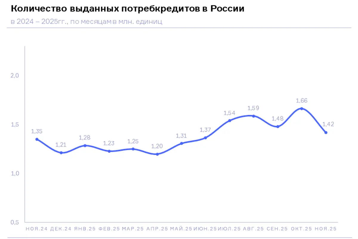 По данным кредиторов, передающих сведения в Национальное бюро кредитных историй (НБКИ), количество выданных потребительских кредитов (кредитов наличными) в ноябре 2025 года составило 1,42 млн. ед., сократившись по сравнению с предыдущим месяцем на 14,7% (в октябре 2025 года – 1,66 млн. ед.). Это самый низкий показатель выдачи потребкредитов с июня 2025 года.
