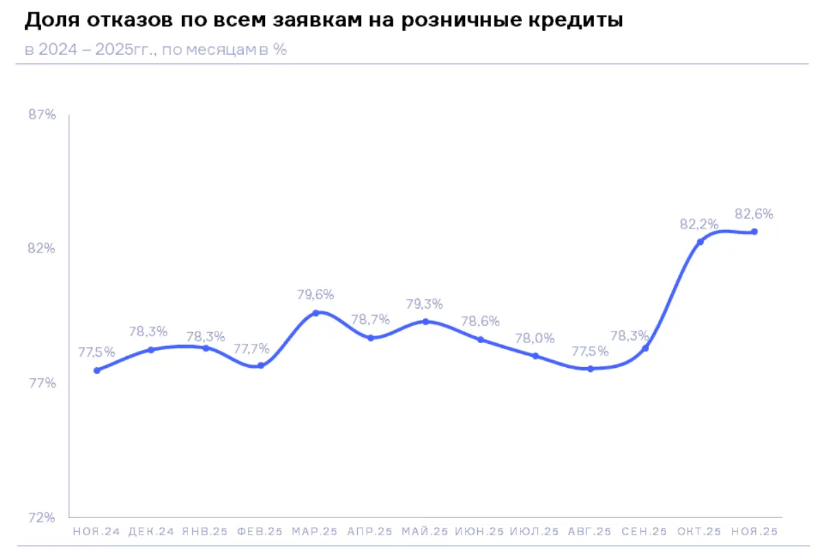 По данным кредиторов, передающих сведения в Национальное бюро кредитных историй (НБКИ), доля отказов по всем заявкам на розничные кредиты (потребительские кредиты, пос-кредиты, кредитные карты, автокредиты и ипотека) в ноябре 2025 года составила 82,6%, увеличившись по сравнению с аналогичным периодом прошлого года на 5,1 процентного пункта (п.п.) (в ноябре 2024 года – 77,5%), а по сравнению с предыдущим месяцем — на 0,4 п.п. (в октябре 2025 года – 82,2%). При этом в ноябре было отмечено самое высокое значение данного показателя за последний год.