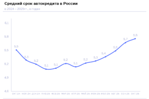 По данным кредитных организаций, передающих сведения в Национальное бюро кредитных историй (НБКИ), в октябре 2025 года средний срок автокредитов (на новые автомобили и автомобили с пробегом) составил 5,8 лет, увеличившись по сравнению с аналогичным периодом прошлого года на 4,5% (в октябре 2024 года – 5,5 лет), а с предыдущим месяцем – на 1,5% (в сентябре 2025 года – 5,7 лет). Данный показатель растет уже шестой месяц подряд и достиг наивысшего значения за последний год.