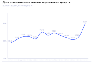 По данным кредиторов, передающих сведения в Национальное бюро кредитных историй (НБКИ), доля отказов по всем заявкам на розничные кредиты (потребительские кредиты, пос-кредиты, кредитные карты, автокредиты и ипотека) в октябре 2025 года составила 81,9%, увеличившись по сравнению с предыдущим месяцем на 3,7 процентного пункта (п.п.) (в сентябре 2025 года – 78,2%), а по сравнению с аналогичным периодом прошлого года – на 5,5 п.п. (в октябре 2024 года – 76,4%). При этом в октябре было отмечено самое высокое значение данного показателя за последний год.
