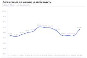 По данным кредиторов, передающих сведения в Национальное бюро кредитных историй (НБКИ), доля отказов по заявкам на автокредиты в октябре 2025 года составила 82,9%, увеличившись по сравнению с предыдущим месяцем на 5,7 процентных пункта (п.п.) (в сентябре 2025 года – 77,2%), а по сравнению с аналогичным периодом прошлого года на 5,5 п.п. (в октябре 2024 года – 77,4%).