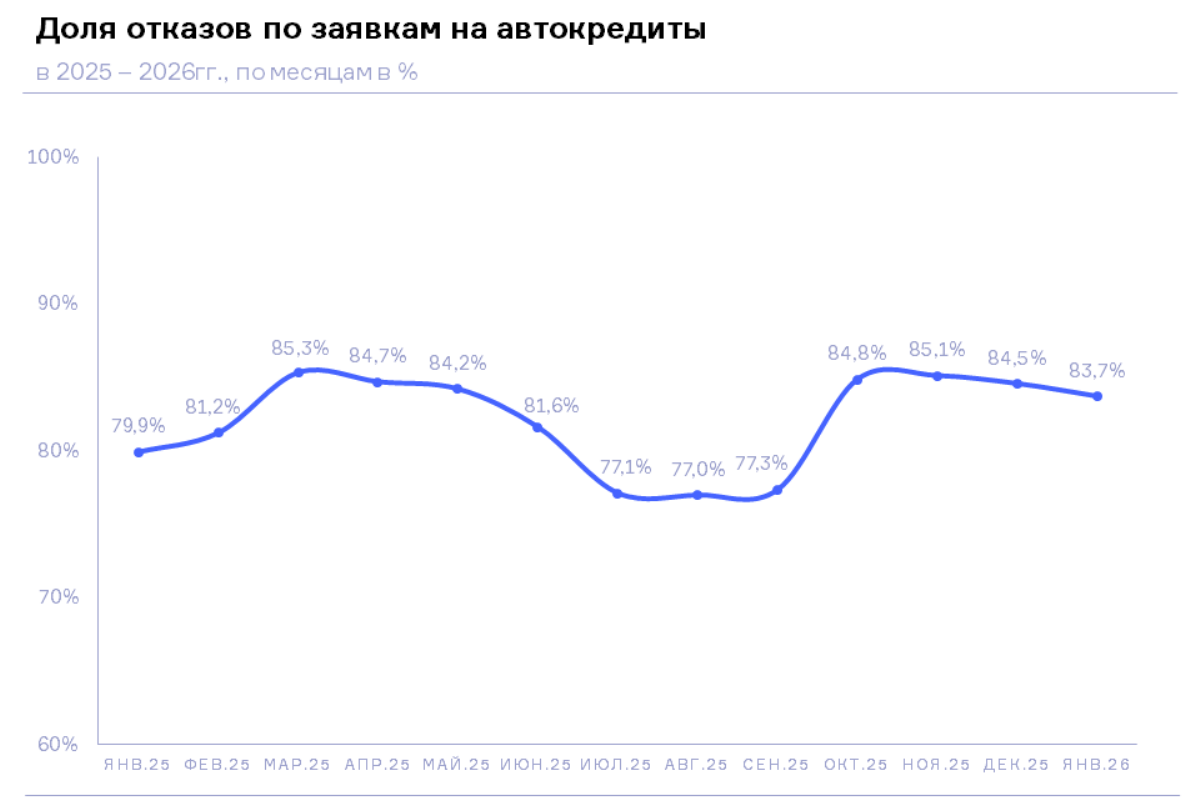 По данным кредиторов, передающих сведения в Национальное бюро кредитных историй (НБКИ), доля отказов по заявкам на автокредиты в январе 2026 года составила 83,7%, увеличившись по сравнению с аналогичным периодом прошлого года на 3,8 процентного пункта (п.п.) (в январе 2025 года – 79,9%).