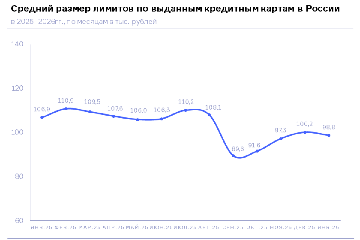 НБКИ: в январе 2026 года средний размер лимитов по новым выданным кредитным картам составил 98,8 тыс. руб.