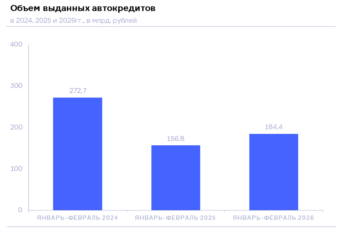 По данным кредитных организаций, передающих сведения в Национальное бюро кредитных историй (НБКИ), в январе-феврале 2026 года было выдано автокредитов на сумму 184,4 млрд. руб. или на 17,6% больше, чем за аналогичный период прошлого года (в январе-феврале 2025 года – 156,8 млрд. руб.).