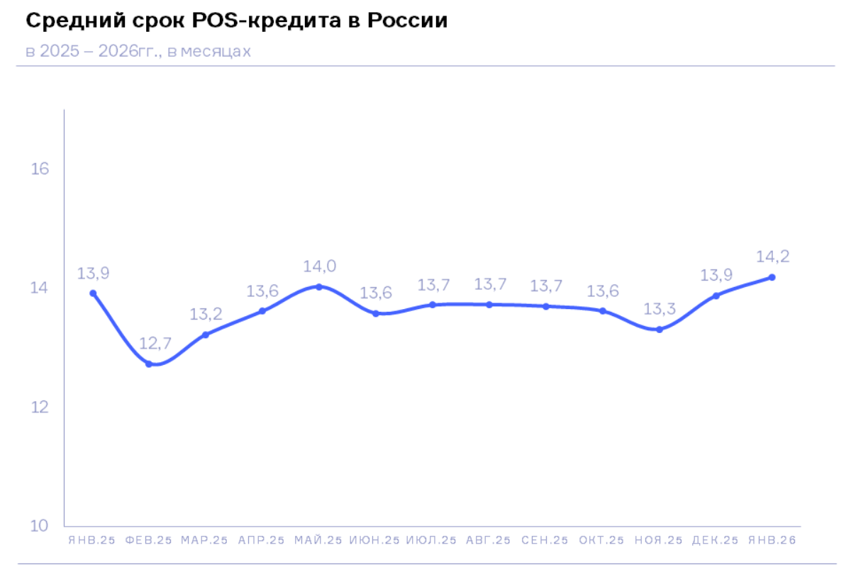 По данным кредиторов, передающих сведения в Национальное бюро кредитных историй (НБКИ), в январе 2026 года средний срок POS-кредитов (кредитов гражданам, предоставленных в торговых точках) составил 14,2 месяца, увеличившись по сравнению с аналогичным периодом прошлого года на 1,9% (в январе 2025 года – 13,9 мес.). В январе 2026 года данный показатель достиг наивысшего значения с октября 2024 года.