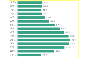 Затем расходы планомерно снижаются, и меньше всего россияне тратят в возрасте 75–79 лет (23,9 тыс.). Любопытно, что к 85 годам среднемесячные расходы вновь немного вырастают — до 25,1 тыс. рублей.