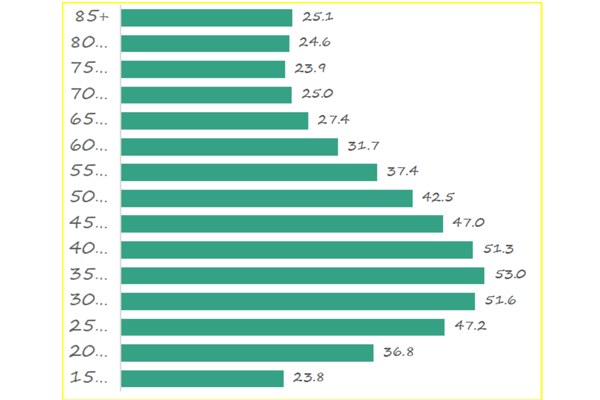 По мере взросления доходы планомерно растут и достигают пика — 53 тыс. рублей — в 35–39 лет. Чуть меньше — 52,3 и 51,6 тыс. — расходуют россияне 40–44 и 30–34 лет соответственно. Эксперты СберИндекса связывают такую статистику как с высокими затратами на обустройство жилья, детей и другие сферы жизни, так и с пиком доходов, который приходится на этот период жизни.