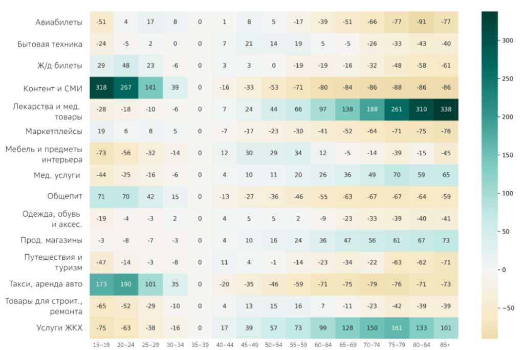 Эксперты также проанализировали долю расходов на различные категории товаров в бюджетах людей разных возрастов, сравнив их с референсной группой 35–39 лет. Так, оказалось, что в бюджете подростков в 4 раза больше доля расходов на контент и СМИ, и на 71% — на общепит. В бюджете 40–64-летних на 4–16% больше доля расходов на строительство и ремонт, а среди людей старше 65 лет более чем в 2 раза больше доля трат на здоровье и на 47% и более — расходов на продовольствие.