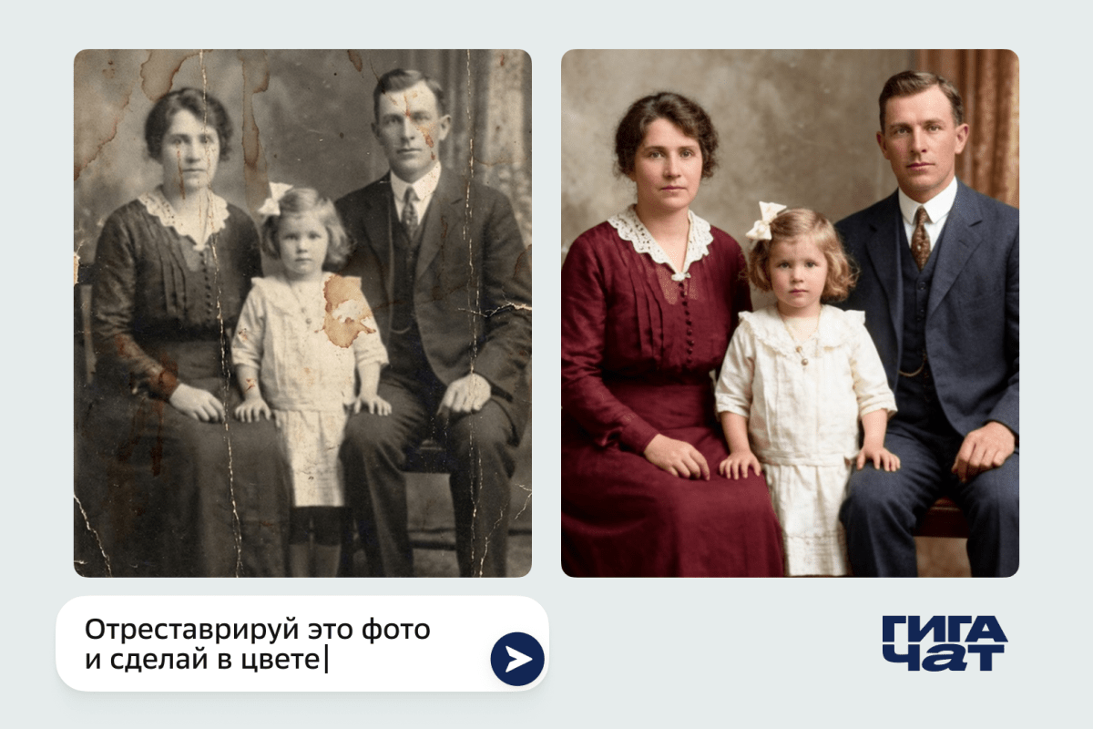 Редактирование изображений стало профессиональным: одним текстовым запросом можно добавить объект в кадр или убрать лишнее, наложить фильтр или совместить элементы из разных изображений. Среди новых инструментов — реставрация старых и повреждённых снимков, в котором модель возвращает чёткость выцветшим и поцарапанным фотографиям. Стилизация превращает фото в иллюстрацию в стиле аниме, комикса или мультфильма. Режим нейрофотосессии позволяет сгенерировать серию новых кадров на основе одной фотографии — с другим фоном, одеждой или локацией.