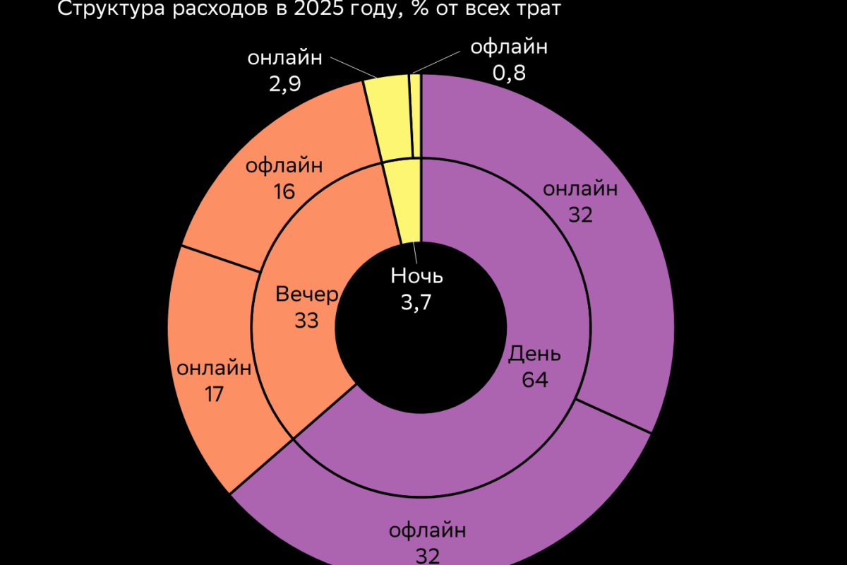 «После пандемии COVID в некоторых странах мира наметилось сокращение ночной экономики, но на Россию эта тенденция не распространилась. В Москве и Санкт-Петербурге доля ночных и вечерних трат, по нашим данным, остается на прежних уровнях и составляет больше трети суточного потребления в городах. Это значение больше, чем в европейских столицах (в Лондоне 25%, в Мадриде 30%), но с ночными тратами покупательского, а не развлекательного характера. Ночная экономика — это не только досуговые формы потребления (рестораны, бары, развлечения и т.д.), но в первую очередь поддерживающие отрасли — от такси и каршеринга, до доставки и продуктов питания. Молодежь лидирует по количеству доставок готовой еды: почти каждая вторая покупка совершается жителями 15–29 лет. А покупатели 30–44 лет составляют 46% офлайн покупок в барах и ресторанах. Современные государства создают отдельные структуры, стимулирующие рост ночной экономики для более полного использования инфраструктуры города, и обеспечивающие баланс интересов с местными сообществами».