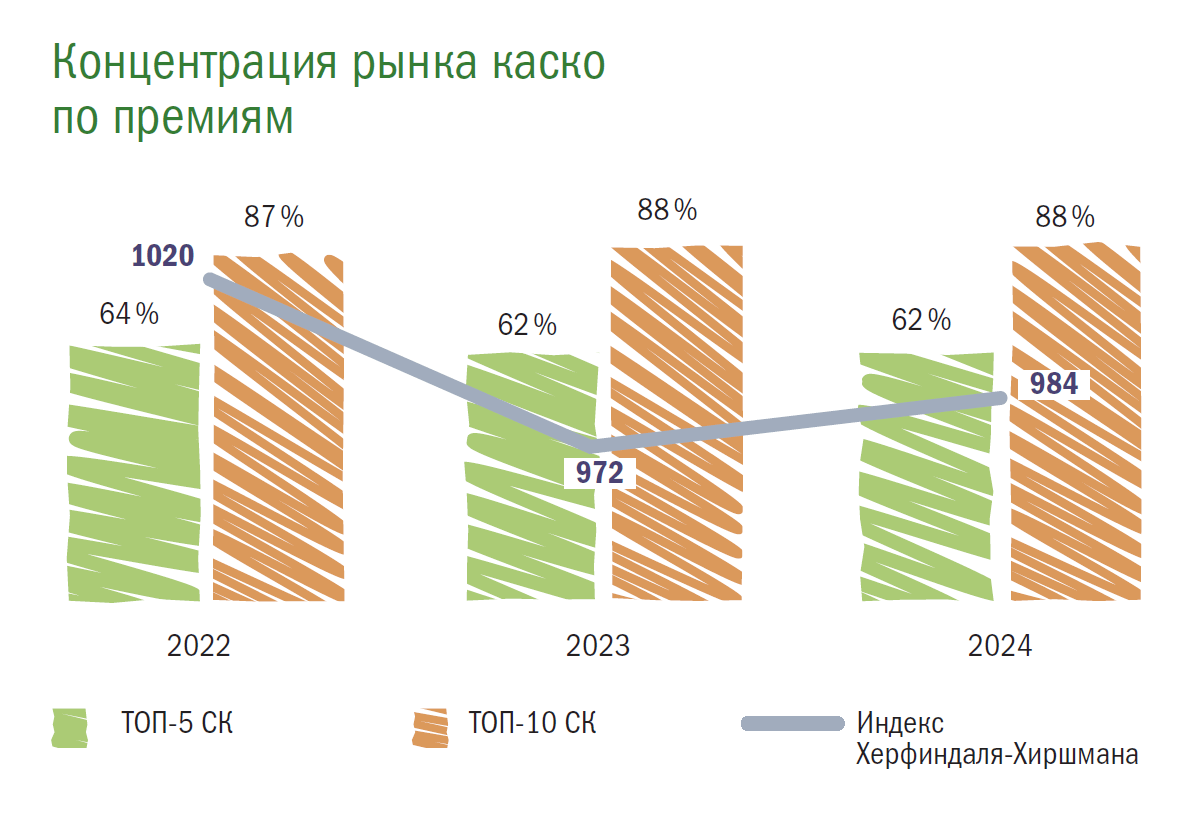 Пять компаний с наибольшими сборами аккумулируют 62 % премий, но при этом доля лидера рынка в последние три года находится в диапазоне 16–17 %.