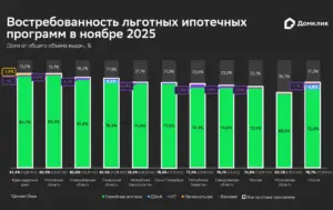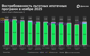 Аналитики Домклик отмечают, что востребованность других льготных ипотечных программ в ноябре 2025 уменьшилась по сравнению с октябрём. Так, самый значительный спад зафиксирован по ИТ-ипотеке: выдачи в ноябре составили 3,9 млрд руб., что почти на треть меньше, чем было выдано по данной программе в октябре. Спрос на Дальневосточную и Арктическую программу упал приблизительно на 20%: с 21,4 млрд руб. в октябре до чуть более 17 млрд в ноябре.