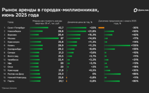 В июне 2025 года, по сравнению с аналогичным периодом 2024 года, цены на долгосрочную аренду в большинстве городов-миллионников выросли. Повышение стоимости можно объяснить сохранением высоких ставок по ипотеке и постепенным сокращением ипотечных программ с господдержкой, особенно в крупных городах. В связи с чем многие потенциальные покупатели жилья переходят в статус арендаторов, что поддерживает рост арендных ставок.