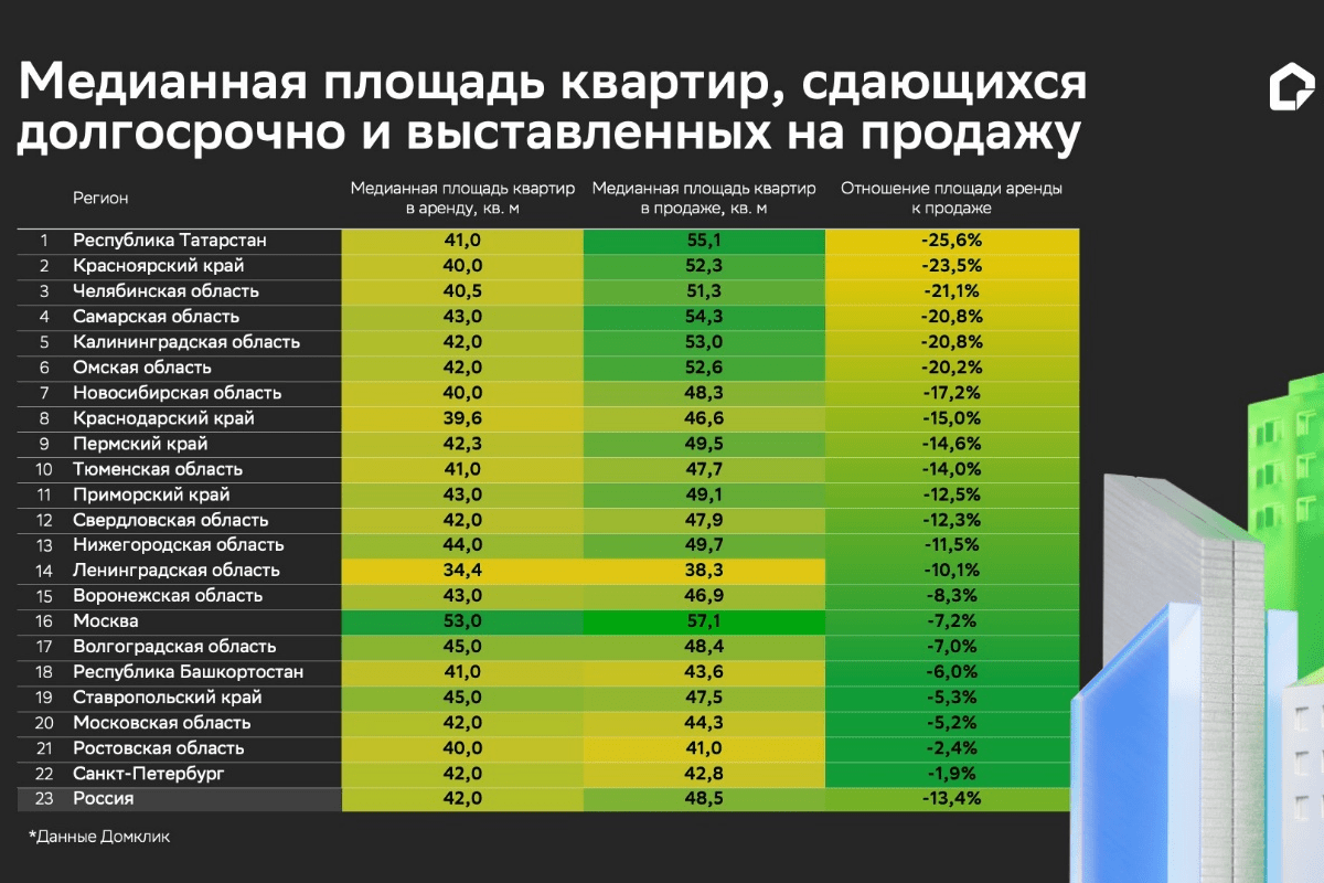 В большинстве крупных регионах квартиры, выставленные на продажу, просторнее арендных. В среднем по России медианная площадь арендного лота составляет 42 кв. м – это на 13,4% меньше, чем у жилья в продаже (48,5 кв. м).